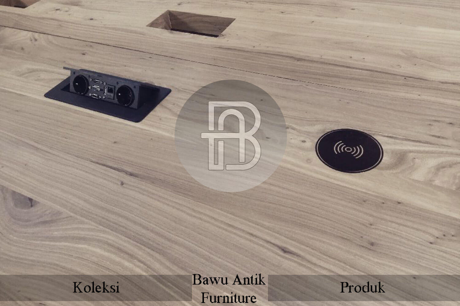 - Akses Kabel (Grommet): Meja rapat modern harus memiliki lubang atau kotak (power grommet) yang terintegrasi di permukaannya untuk akses mudah ke stop kontak, charger USB, dan kabel HDMI/LAN.